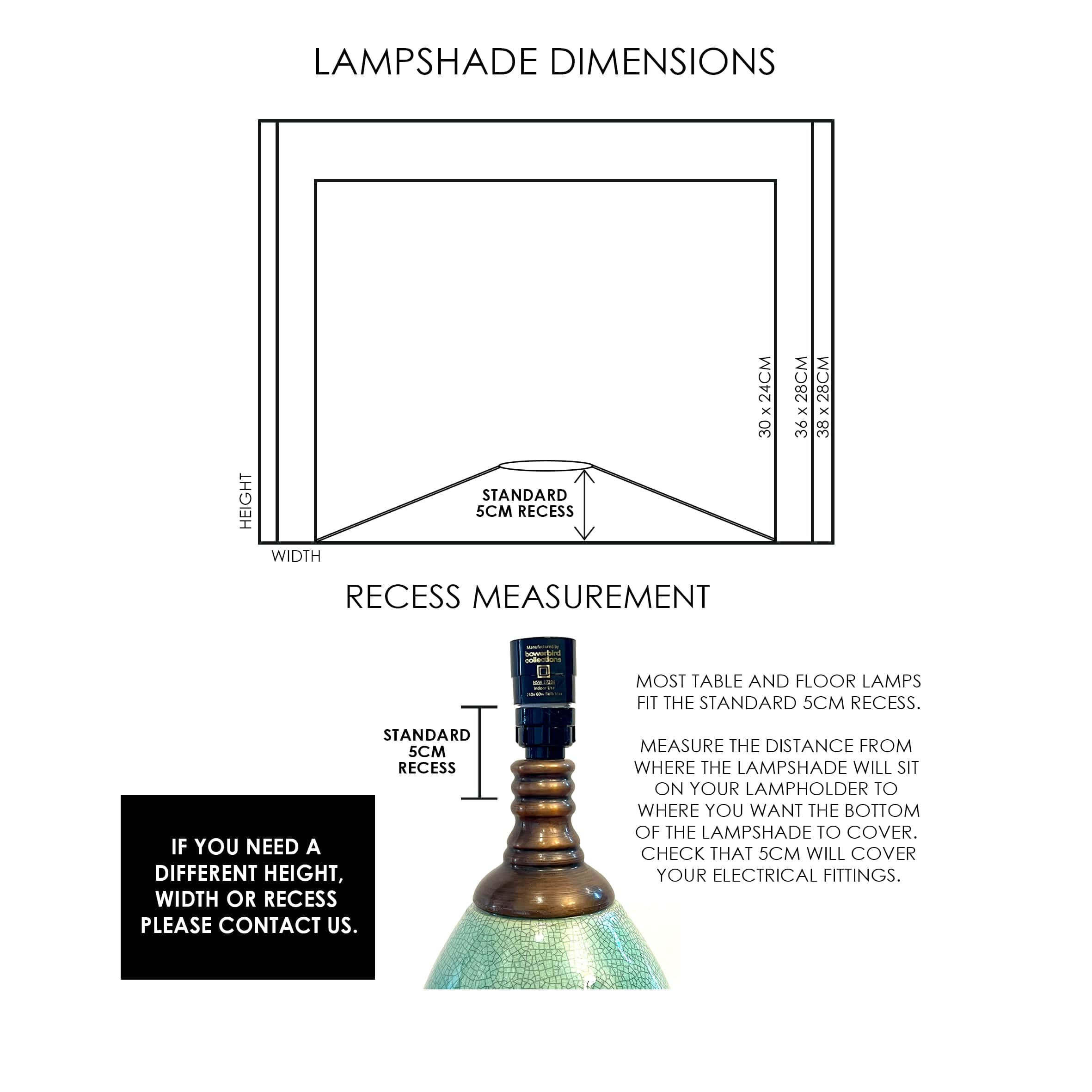 RECESS | Our lampshades are made with the standard 5cm (2”) recess. The lampshade recess is the measurement from where your lampshade will sit on your lampholder to where you want the bottom of the lampshade to cover. Check out our Lampshade Dimensions diagram below, or refer to our Guide to Lampshade Fittings.