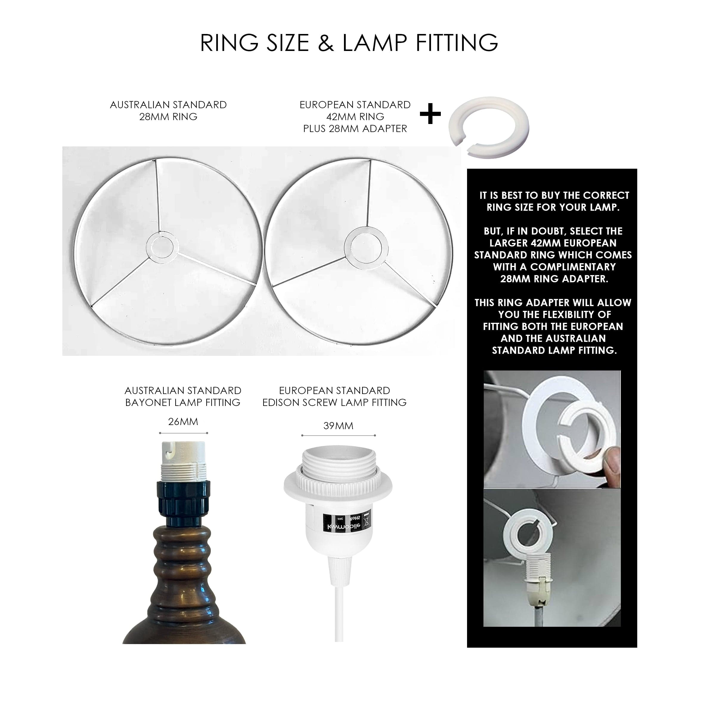 RING FITTING | We offer 2 ring size options, either a 28mm ring to fit an Australian Standard Lamp Fitting or a 42mm ring to fit a European Standard Lamp Fitting. Check our Ring Size & Lamp Fitting diagram below to help you choose the right ring size for you. If in doubt, select the larger European Standard Ring which comes with a complimentary 28mm ring adaptor. This ring adapter will allow you the flexibility of fitting both the European Standard Fitting and the Australian Standard Lamp Fitting. For more information about Lamp & Lampshade fittings please refer to our Guide to Lampshade Fittings.